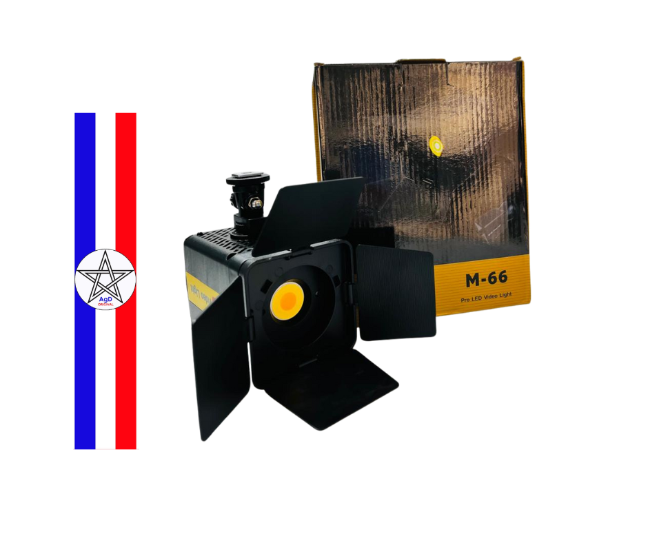 Emballage : L’image montre également la boîte d’emballage du produit, qui est noire avec des accents dorés et l’inscription “M-66 Pro LED Video Light”.