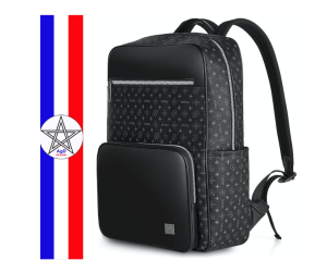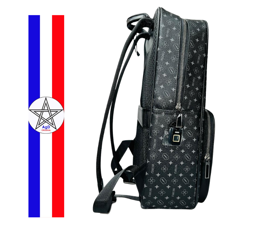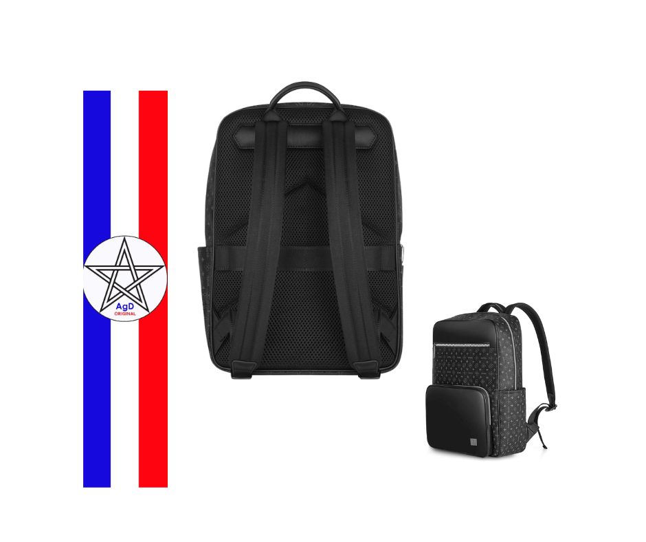 Description visuelle : Le sac à dos est principalement noir, avec un motif monogramme discret (logo WiWU) sur la majorité de sa surface. Il présente des sections en cuir ou PVC lisse et noir sur le rabat supérieur et la poche avant inférieure. Il dispose de plusieurs compartiments zippés et de bretelles réglables. Un petit logo métallique est visible sur la poche avant inférieure.