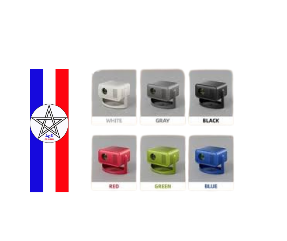 Design : La boîte présente une image du projecteur lui-même, montrant un appareil compact, blanc et rond, posé sur une petite table d’appoint.