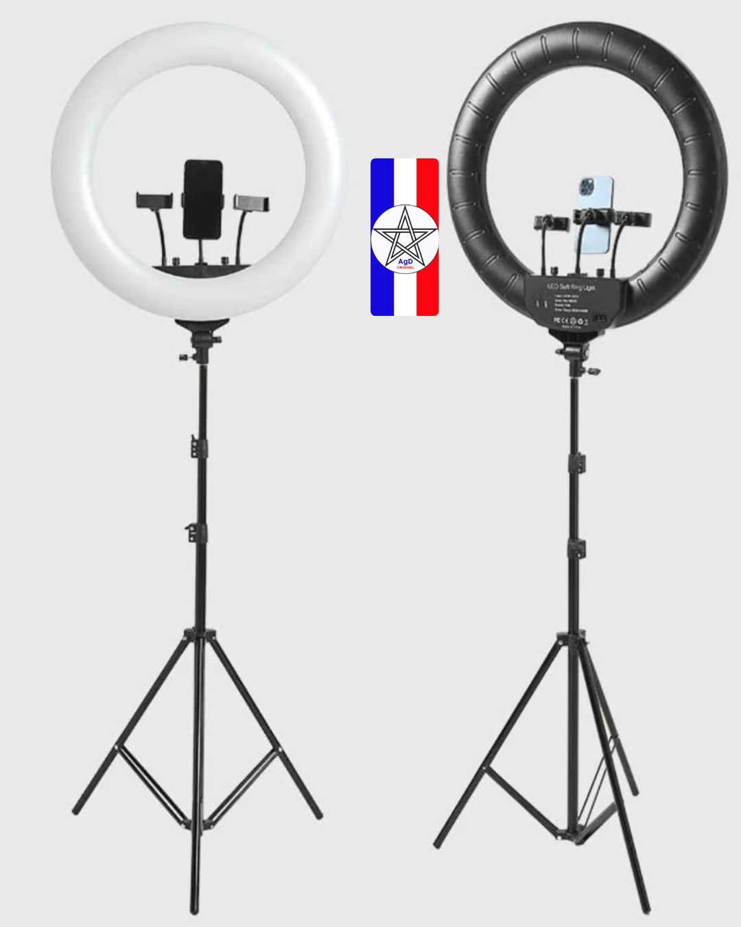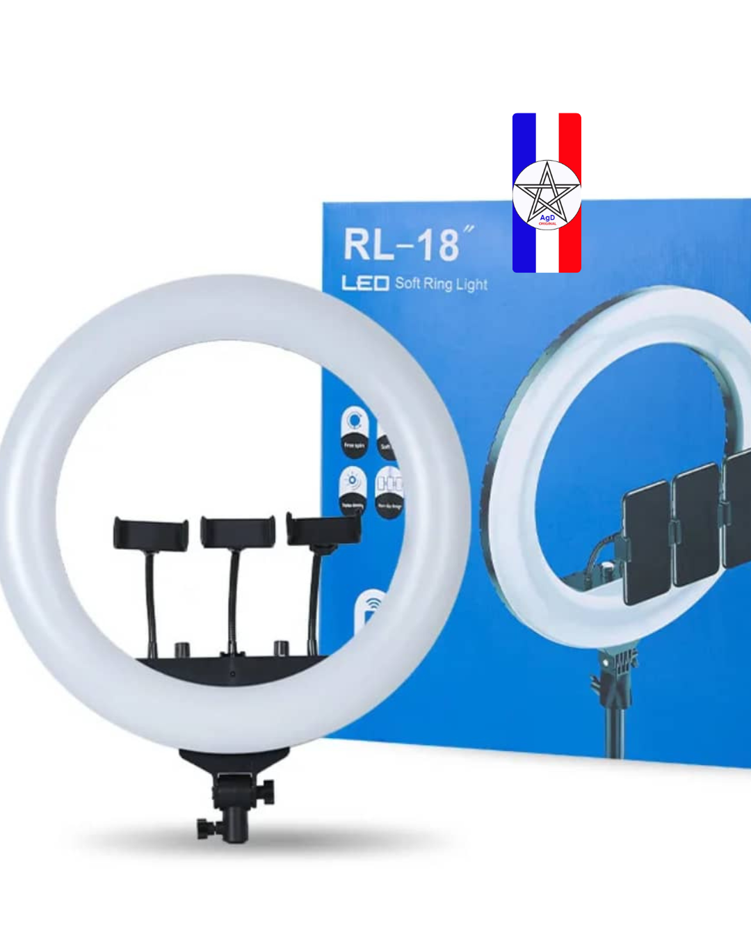 La ring light LED souple RL-18″ est un anneau lumineux professionnel de 18 pouces (environ 45 cm) de diamètre, conçu pour fournir un éclairage doux et uniforme, idéal pour la photographie, le maquillage, le streaming en direct, et la création de vidéos sur des plateformes comme YouTube ou TikTok.